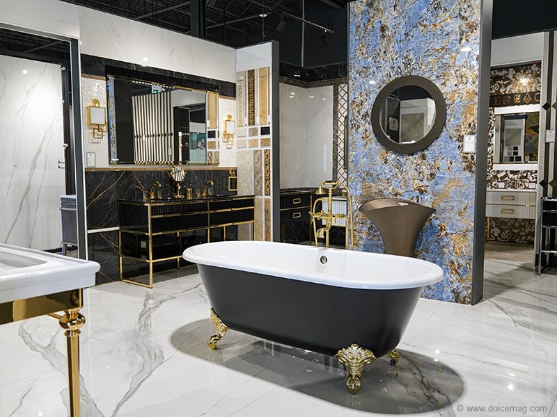 The new showroom is a testament to that. As well as being ideally situated in Toronto at 25 Torbarrie Rd., its 20,000 square feet showcase the variety of brands, fixtures and styles Canaroma has to offer. Whether it’s an extensive tile gallery, elaborate fixtures, a working water station, its Slab Hall, exclusive Versace boutique or vanities from around the world, there’s something for all tastes.