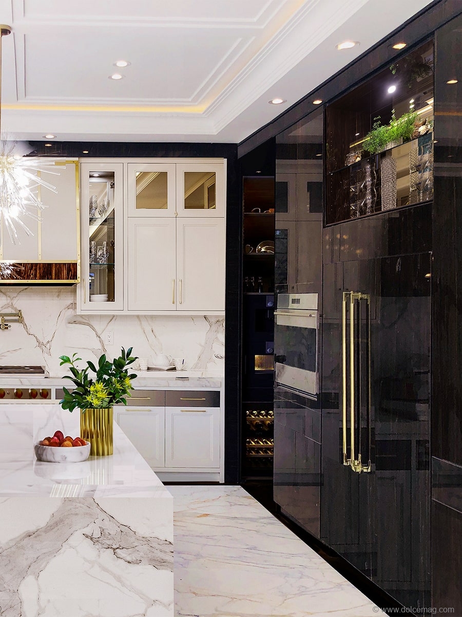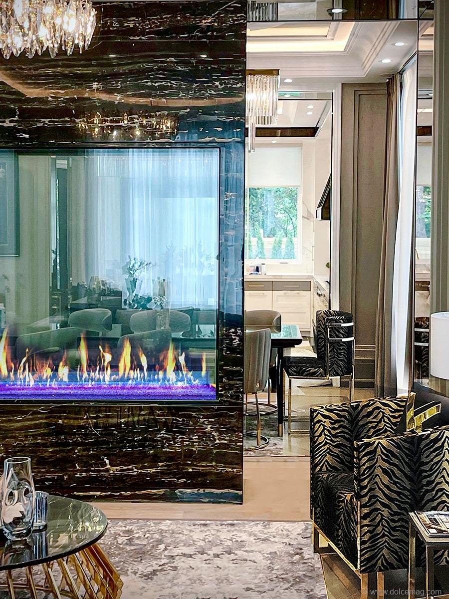 The Mississauga Road home features main-floor Calacatta and Nero Marquina slab marble and bronze inlay as well as a five-foot-wide transparent fireplace, instead of the typical three-foot-wide fireplace, connecting the living and dining room. The home also features a double-height ceiling in the family room because, as Shak says, if you have the space, use it and create it.