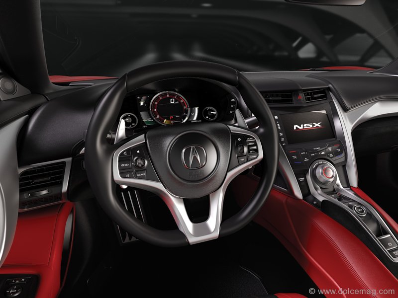 The new NSX is substantially longer and wider than the original, with a frame made of aluminium, high-strength steel and what they’re describing as “other advanced materials.” Up front, Acura’s now-signature Jewel Eye LED headlights bookend the chrome strip of the thinner power plenum grille, while massive, angular honeycomb intakes give it a mischievous grin. Its body’s flowing lines are accented by sharp, knife-like angles to give it an ultra-modern style, and gaping air intakes blend seamlessly with the C-pillar. Lean, modern tail lights run the width of its rear, and huge air extractors and diffusers dominate the bottom of the back bumper and frame four centre-mounted exhaust pipes.