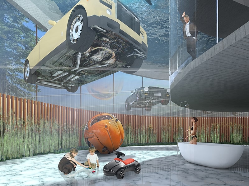 The top-tier garage is strategically designed to maximize the visibility of the cars that are parked inside. With the car collection placed at the centre of the house, it is surrounded between levels made up of glass floors: “It [Garage-8] is designed so that each automobile can be admired when [its owner is] eating, sleeping, bathing, swimming, jogging and practising their golf swing. Even when dressing, they can choose their clothes, shoes, watches, cufflinks and jewelry, and, of course, the car that goes with them.” It’s like being able to observe a fish in a fishbowl, but much more alluring.