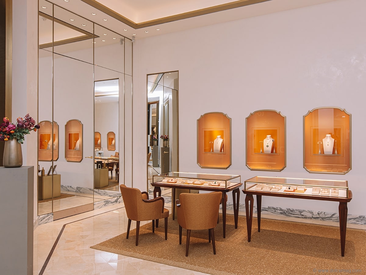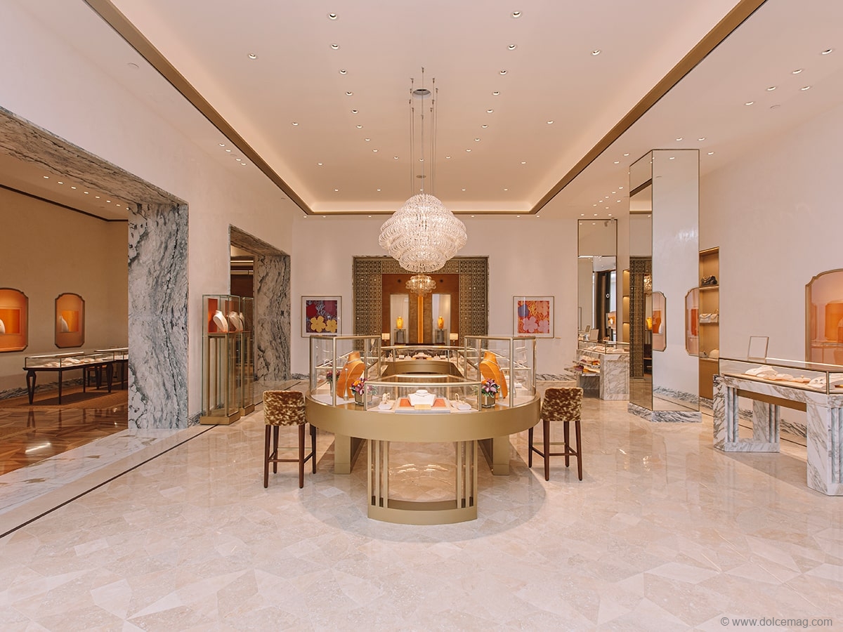 Partnering with famed architect, Peter Marino, on the design concept, the newly expanded 3,000-square-foot boutique at the Yorkdale Shopping Centre features iconic luxurious materials and mid-century Italian design. Guests are welcomed into an opulent space featuring white Travertino Navona marble and walls finished in white and gold-hand-applied Scagliola plaster. The recognizable Bvlgari Condotti eight-point star in red porphyry, which dates back to the first shop opened, is a focal point in the middle of the boutique. The quintessential Condotti windows within the boutique recall the original windows still present in Bvlgari’s historic flagship on Via Condotti in Rome, while two Murano crystal chandeliers made by Italian artisan Vistosi illuminate the interior.