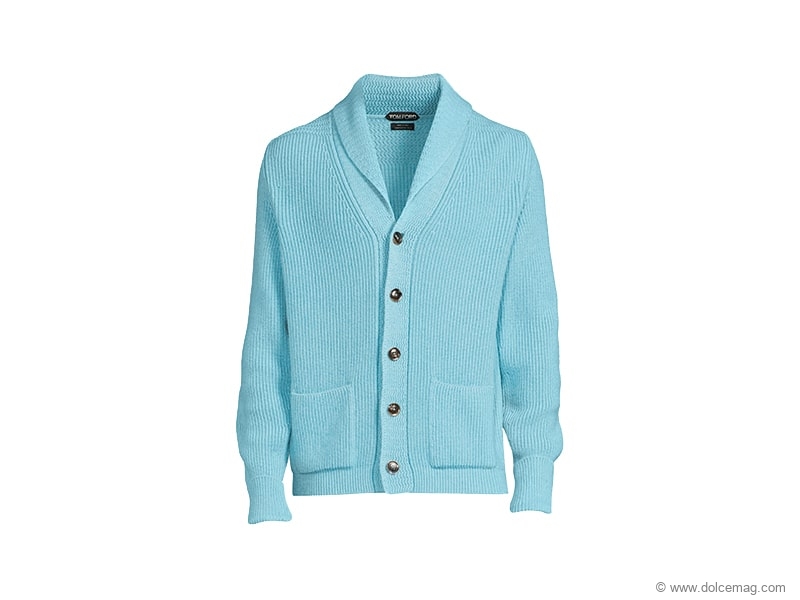 CARDI-CHIC Made with 100 per cent pure cashmere, Tom Ford’s baby-blue knit cardigan will work for both cool summer evenings as well as for transitioning into the fall season.