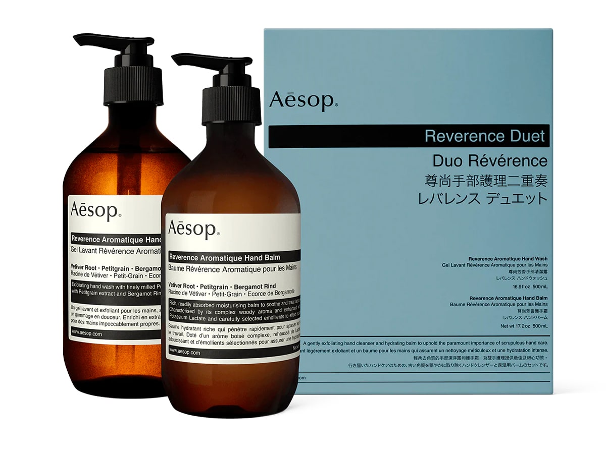The Aesop Reverence duet features a hand wash and balm in the brand’s distinctive scent.