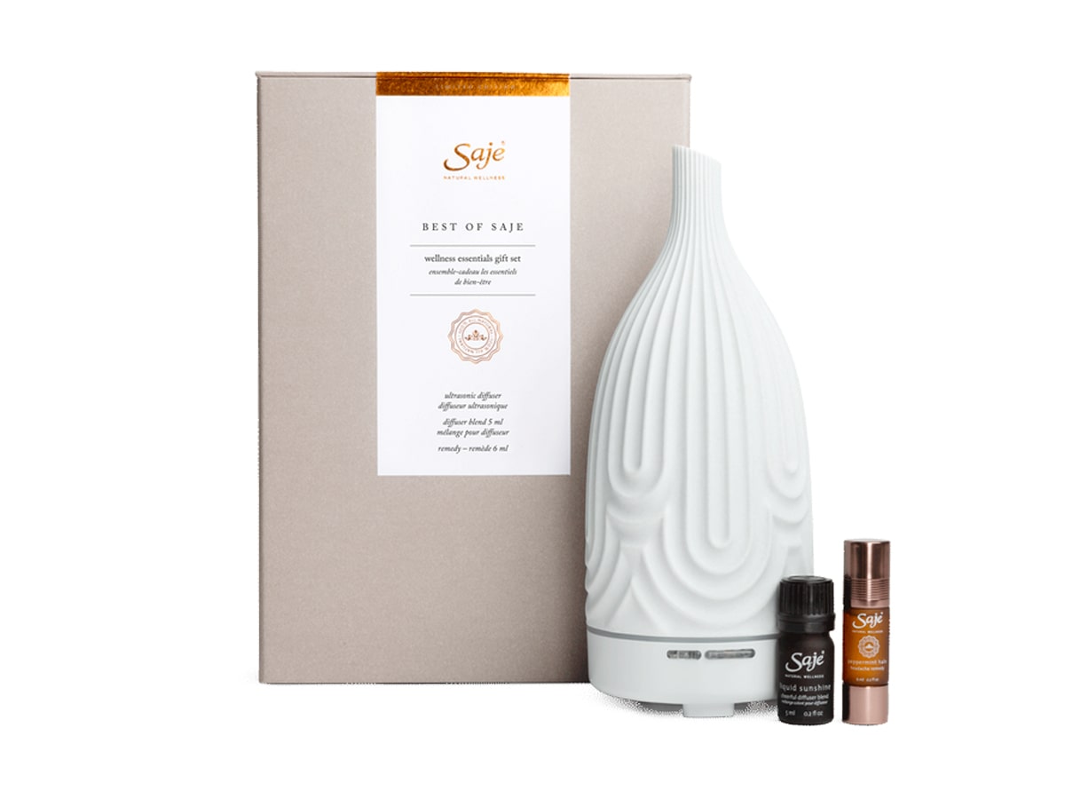 The best of Saje wellness essentials gift set features everything you need to relax and unwind. It comes with a limited-edition diffuser as well as a diffuser scent and rollerball.
