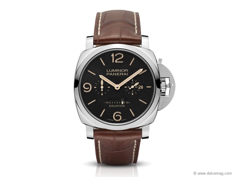 This Panerai watch beautifully displays a sophisticated and complex mechanism called the “Equation of Time,” which is the difference between the mean time and the true time indicated by the solar meridian.