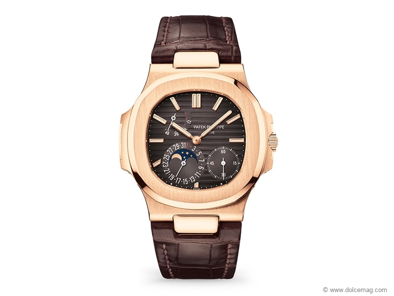Embodying a luxury sports watch in the most elegant way, the Nautilus displays a black brown dial surrounded by rose gold, a sapphire-crystal case back, an octagonal-shaped bezel, and a horizontally embossed dial.