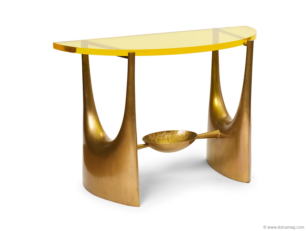 - Console, designed in 1968 and executed in 1989 by Philippe Hiquily and Jean-Claude Farhi (1940- 2012) of gilt bronze and yellow Altuglas acrylic resin, numbered 7/8 with the foundry mark “Bocquel Fd.” Sold for US$21,760 inc. premium.