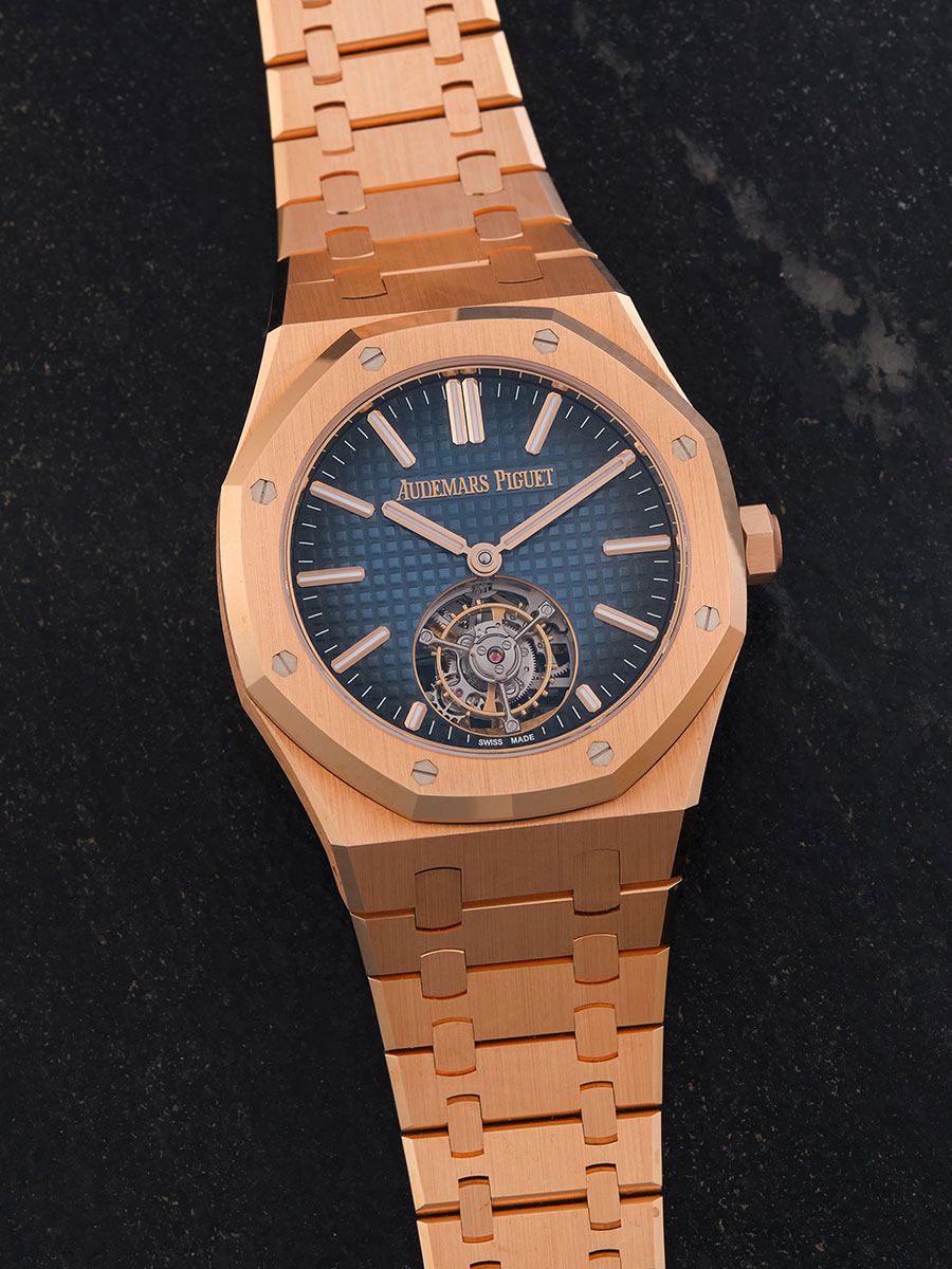 Since its debut in 1972, the Royal Oak revolutionized the world of horology as the premier stainless- steel luxury sports watch, and is rightfully hailed as a design icon. Born of a collaboration between the Swiss watchmaker and legendary watch designer Gérald Genta, the Royal Oak concept was a true groundbreaker, unlike any watch design that had come before it. Its sleek steel form remains sublimely modern, and its cult-collector status keeps growing. The present example features a self- winding flying tourbillon, created specifically for the 50th anniversary of the Royal Oak in 2022. Housed in an elegant pink gold case with a smoked blue dial showcasing a grande tapisserie pattern, the movement also features a special gold rotor with a ‘50 Years’ logo, commemorating the iconic Royal Oak’s half-century celebration.