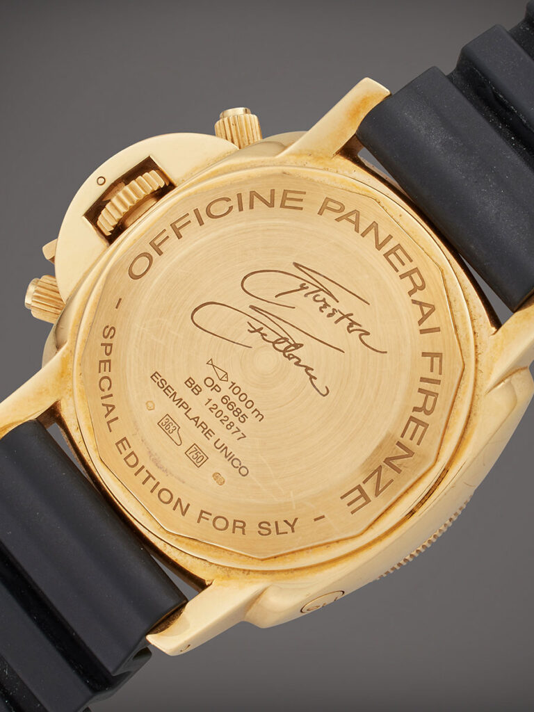 Since then Stallone continued his collaboration with Panerai, resulting in the creation of several limited edition SLYTECH models. However, the reference PAM00269 stands apart as a unique piece made exclusively for him. Crafted in 2006, this Luminor Submersible Chronograph boasts a substantial 47 mm yellow gold case and black dial. Interestingly, its design bears resemblance to the PAM00225 Luminor Submersible Chronograph Slytech, released the previous year but encased in titanium. Setting it apart, the case back of the PAM00269 features distinct engravings, including ‘Special Edition for SLY’ and ‘Esemplare Unico,’ emphasizing its unique nature.