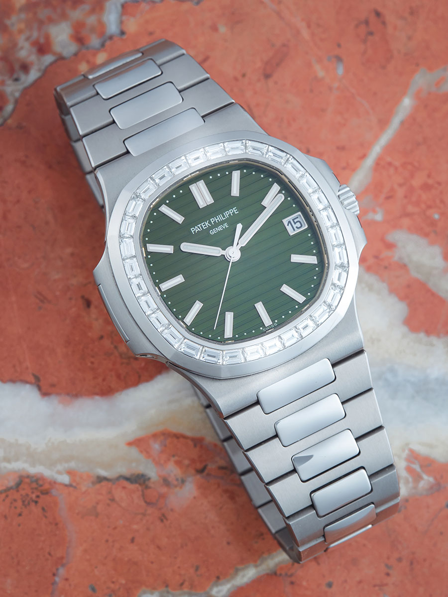One of those superstars is the 2021 stainless steel Nautilus reference 5711/1300A-001. This model marks the debut of the highly sought-after ‘sunburst olive-green’ dial within the Nautilus line, and also introduces Patek’s first gem-set stainless steel 5711. The watch boasts a bezel adorned with 32 flawless top Wesselton baguette diamonds, meticulously crafted to enhance the curvature of the Nautilus’s contours.