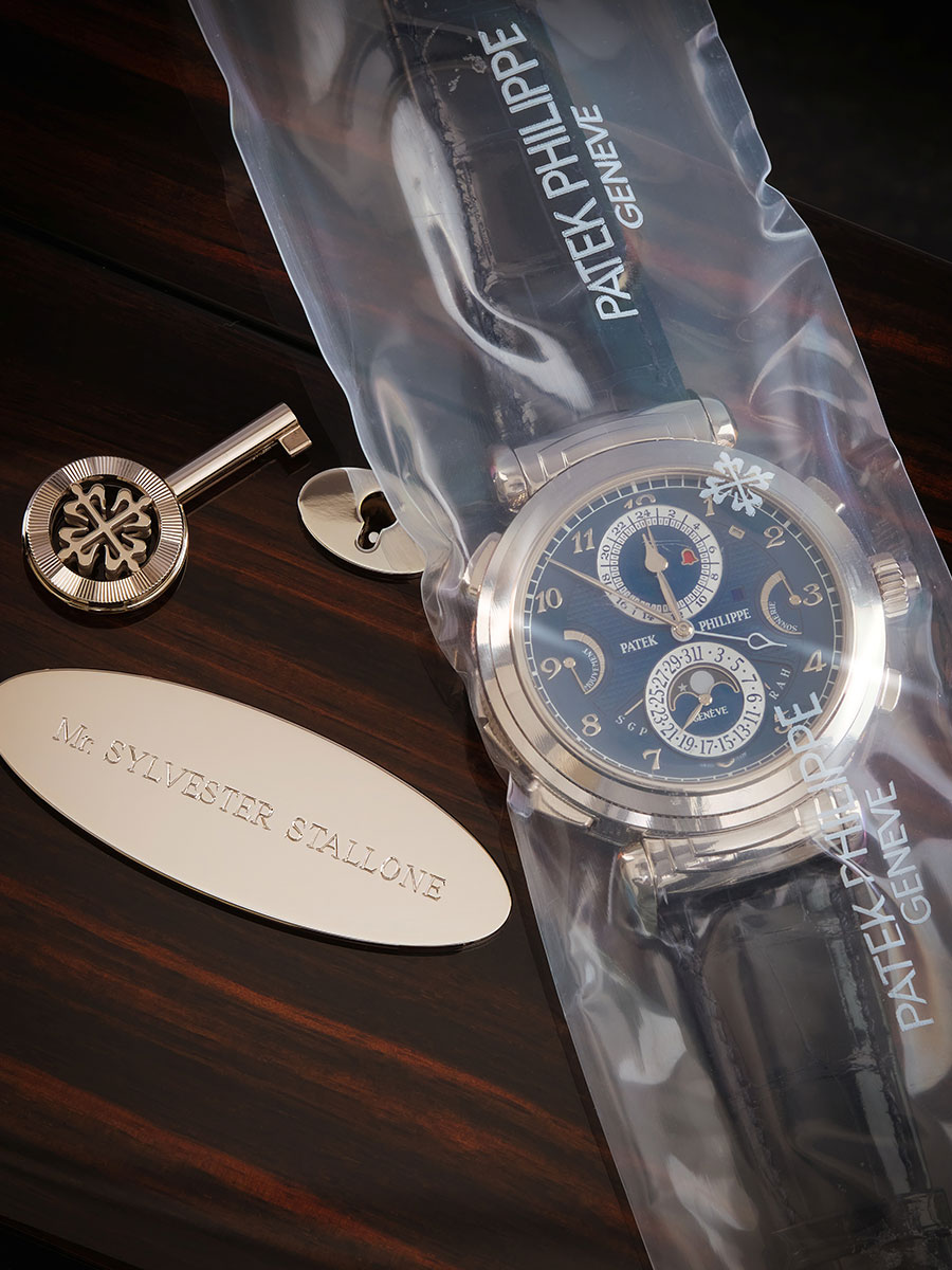 Presented in its original single sealed casing, the watch is accompanied by a grand presentation box engraved with Stallone’s name and a Grandmaster Chime book bearing his name on the cover and inside cover. The lot additionally includes a Certificate of Origin confirming Stallone as the original purchaser, product literature in a large leather portfolio, a collection book, travel case, cufflinks, USB drive, sealed setting pin, hang tag, an Apple iPad with a Patek Philippe leather case, adapter, charger, and Apple earpods with a Patek Philippe case.