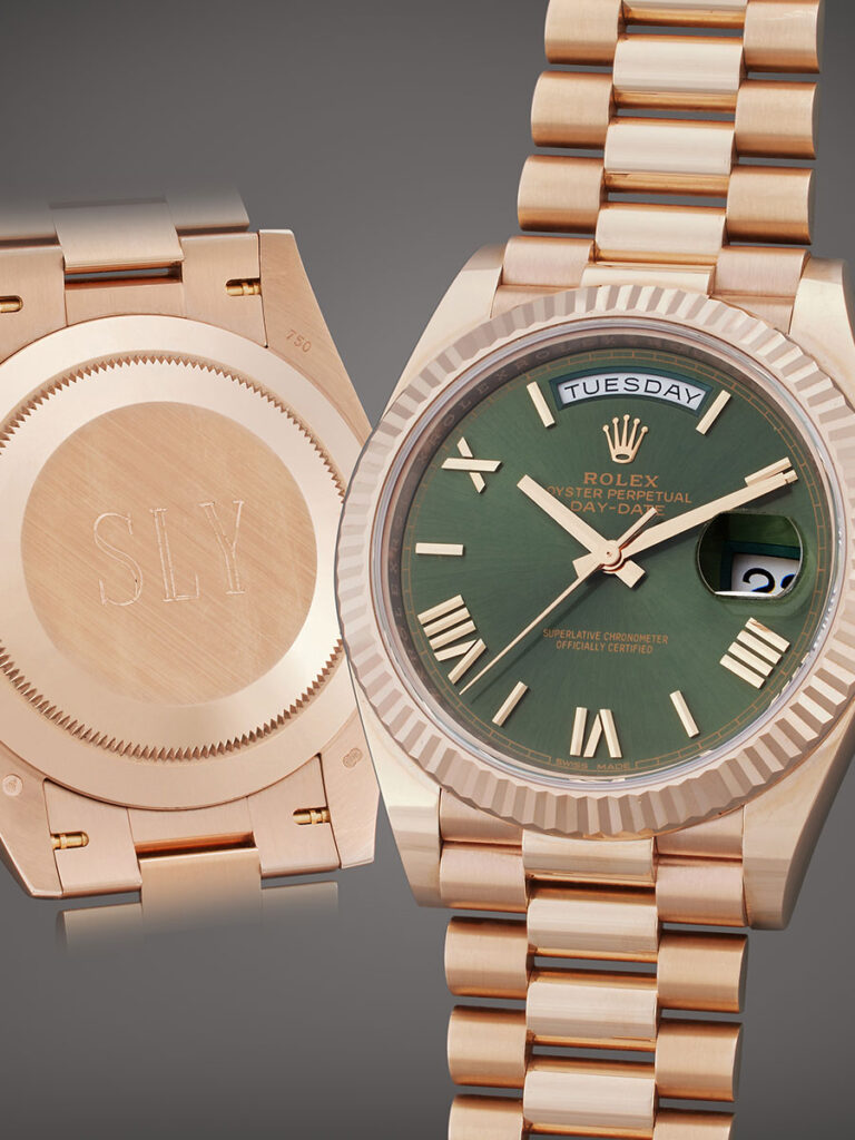 Often referred to as ‘The President’ due to its association with Lyndon B. Johnson wearing a Day-Date, it has become the timepiece of choice for dignitaries, champions and various captains of industry. Bearing the nickname ‘Sly’ engraved on the case back, this watch not only embodies luxury, but also represents the dedication and hard work that have characterized Stallone’s career.