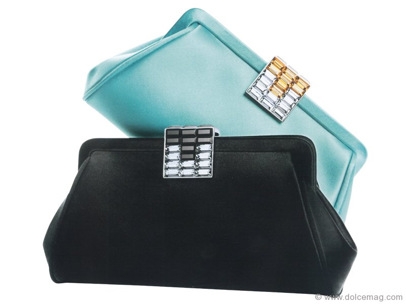 These onyx and turquoise satin clutches – equipped with gorgeous crystal detailing – keep its carriers ready to make memories with enough room for a camera, smart phone, and other necessities. www.tiffany.com