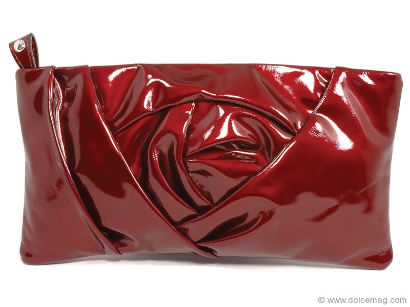 This luxurious, lacquered leather rosebud in a cheery holiday shade makes for a girly companion to your little black cocktail dress. www.laurabuccellati.com