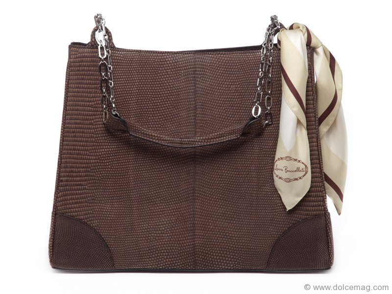 Quilted leather fabric meets a sweet silk scarf and charming chain handles for a standout look. www.laurabuccellati.com