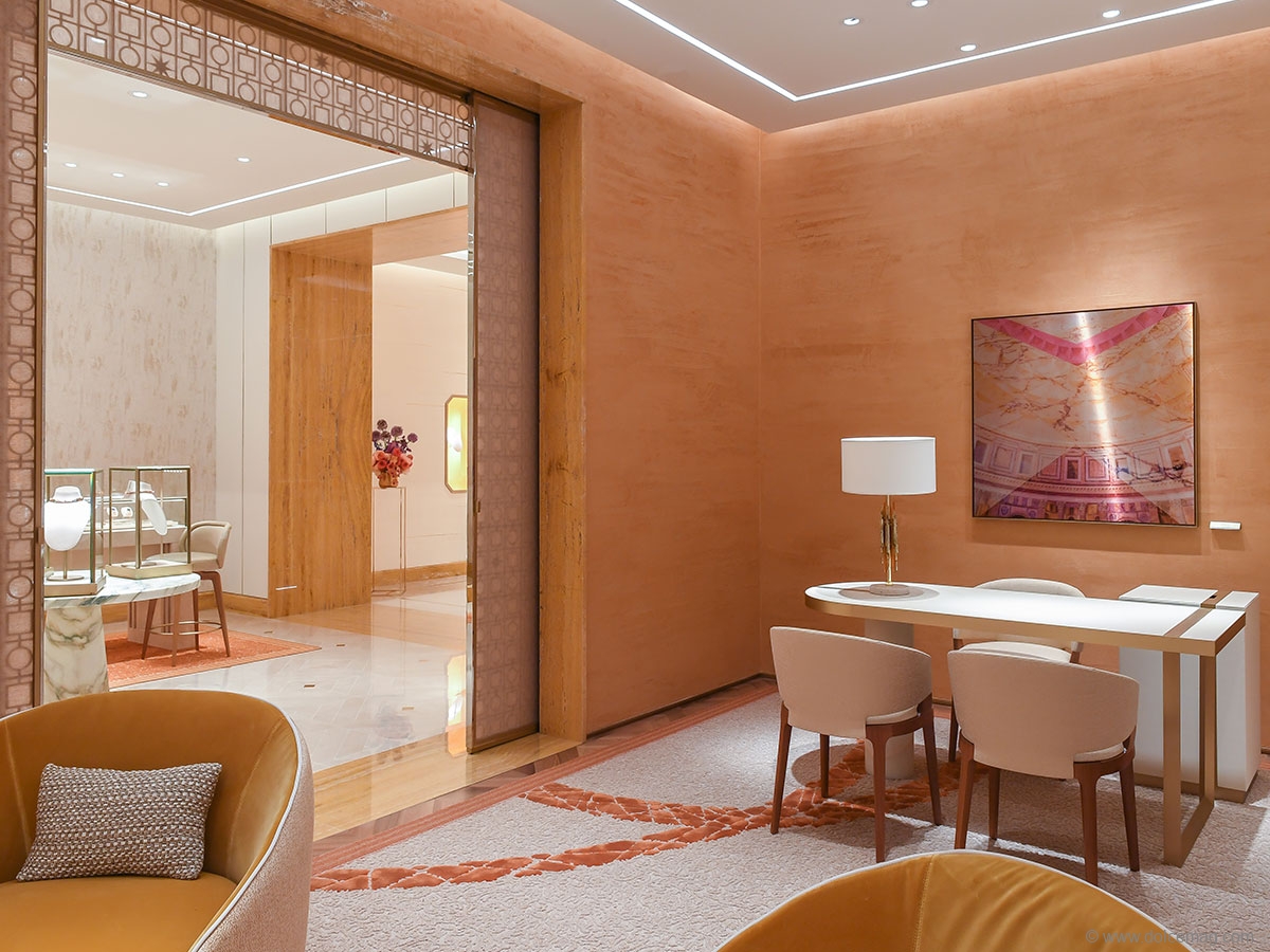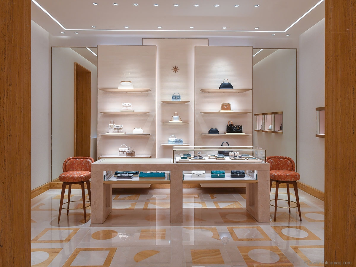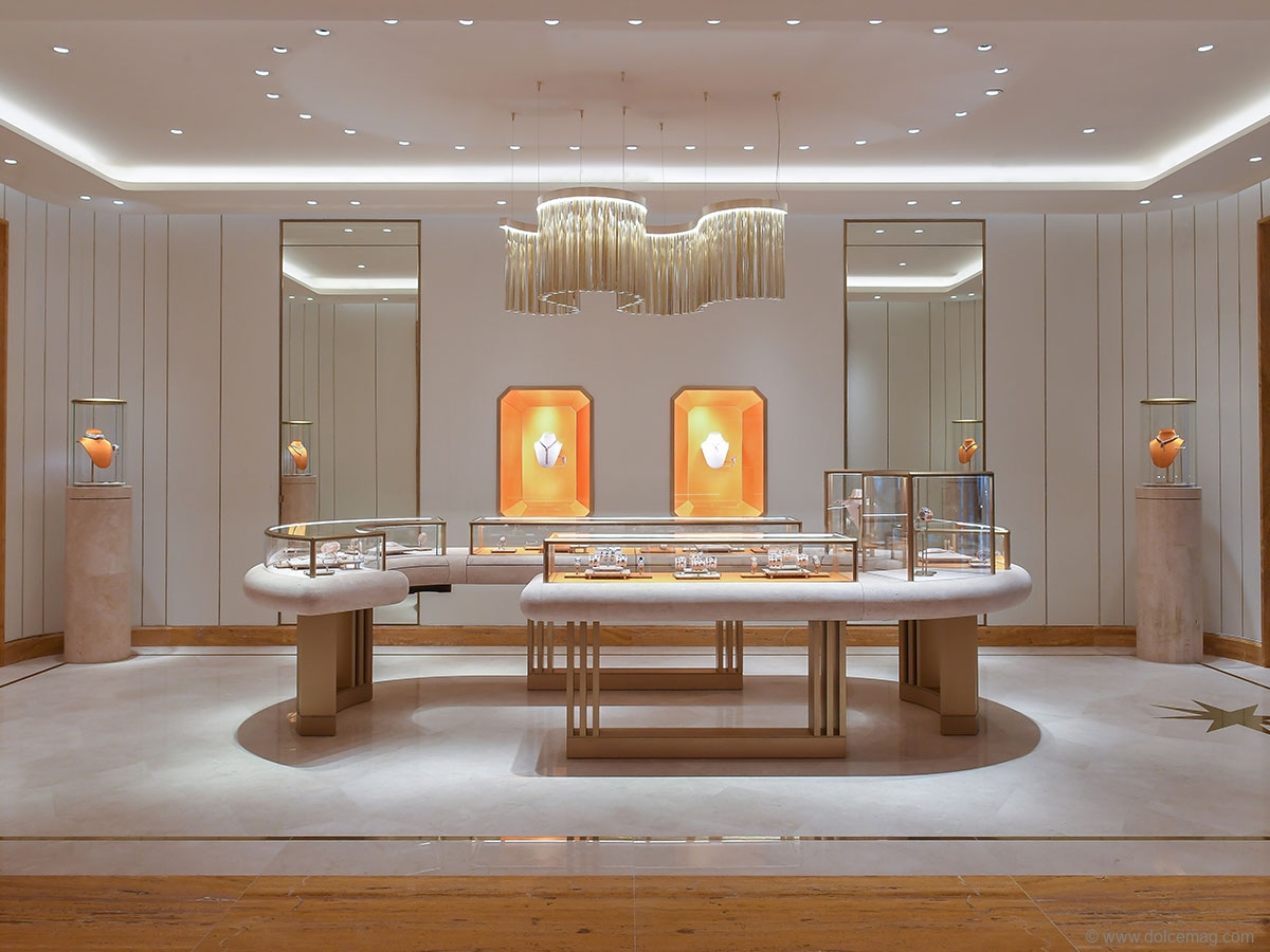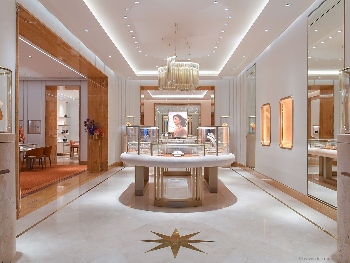Upon crossing the boutique threshold, guests are led through a series of adjoining rooms, featuring iconic jewelry collections, leather goods, a dedicated watch area and a private lounge, all connected by a central gallery displaying Bvlgari jewels.