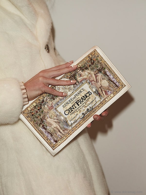Born in Switzerland, Tessier decided to move to Paris to complete her formal education in interior design. Tessier’s clutches are influenced by her interior design training and traditional embroidery techniques, such as Lunéville Crochet, as well as nifty nuances, such as the application of gold threads: “The fabrics inspire me because I see a lot of fabrics through the job of interior design, art galleries and the French Art de Vivre. In the last collection, the French haute couture, I tried to keep an old savoir faire on my bags … Most of my inspiration comes more from design and art than it does fashion. I’m not so inspired by fashion. I never look at which colour will be in season. I’m not influenced by that.”