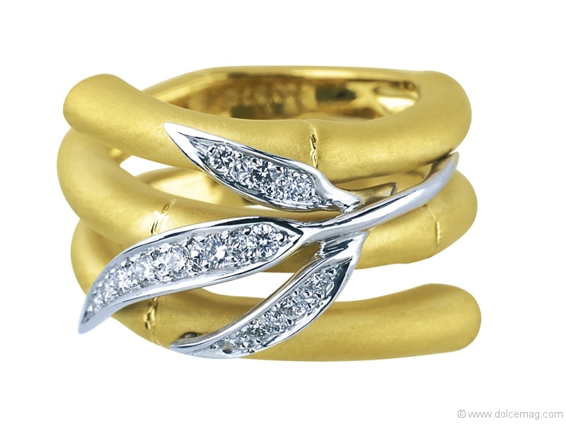Sensuality reigns in of all of Carrera y Carrera’s jewelry collections. Passion shines particularly in Carrera’s 2015 collection, Romance en el loto (Romance in the lotus), which pays homage to Manuel’s wife and muse, Marina, and their love story, which spans more than 50 years. Whimsical golden frogs (gold features in many of Carrera’s collections) represent the couple and are symbolic of the many firsts in their epic love story. Carrera also places this symbol of mutual love on his lotus leaf designs, the lotus being an emblem of purity of body and soul, beauty, perfection and grace — traits intrinsic to Marina.