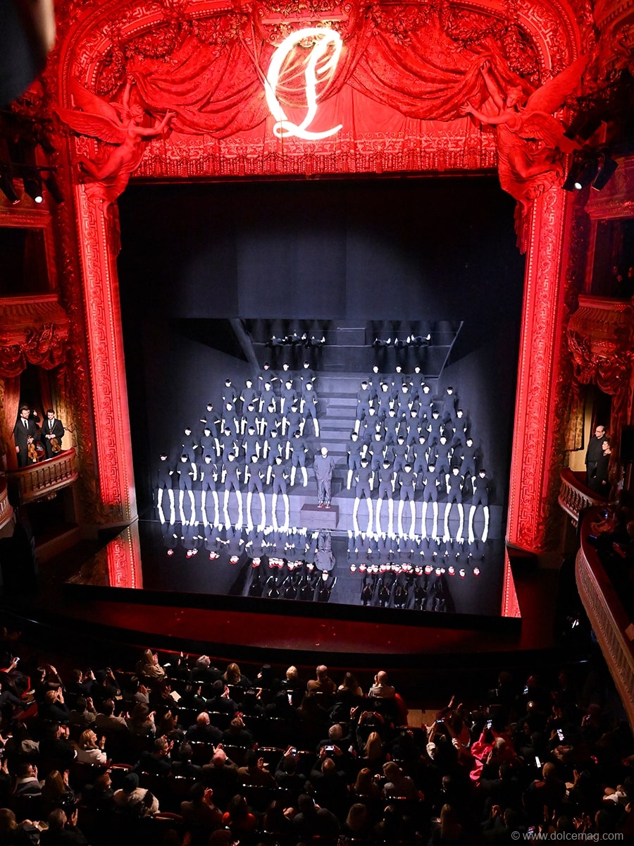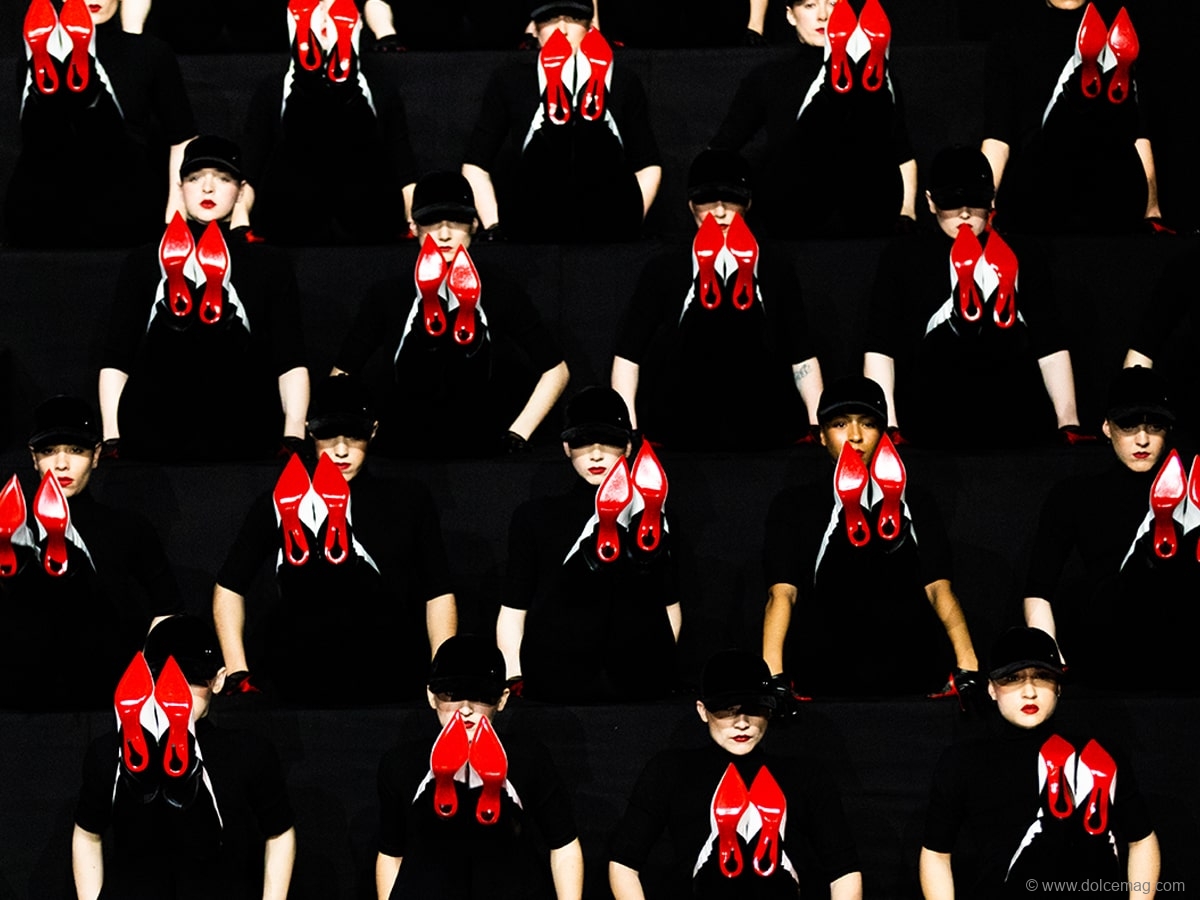The choreographer, accompanied by 50 dancers, took to the stage wearing black and white Astribottas knee-high boots, exclusively made for the show, introduced a new vision of dance called ‘tutting’, an interpretive style involving intricate movements of the body and hands in geometric shapes, performed in synchronized harmony. The stage was entirely covered with reflective material, creating an optical illusion of infinite red soles, which is the Maison’s most iconic symbol.