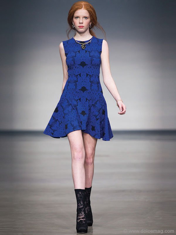 A: Winter 2013–14 is so rich with fabric designs. We make our own jacquard fabric designs that are exclusive to the brand, and we really enjoyed working with the baroque theme this season. One of my favourites is the baroque jacquard day dress. The fun part of this collection is the palette of winter-inspired colours. We used some cream mixed with black, royal blue and flamboyant red in the day dresses. And, of course, no collection of mine would be complete without lace. This season, you’ll also find a new lace weaving specially made in a circular mode. Very Florentino.