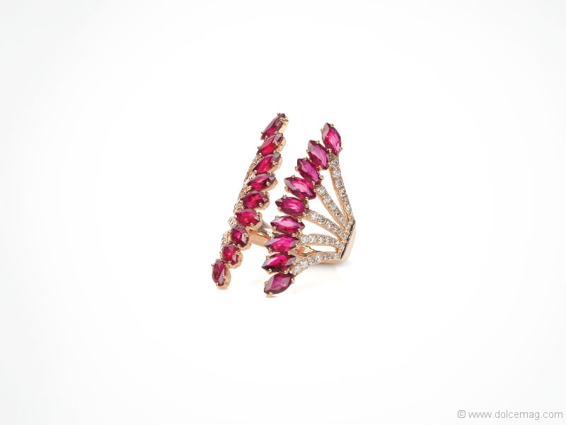 9. Ravishing rubies and diamonds adorn this ring. The gems are laid in 18k rose gold by Royal De Versailles.