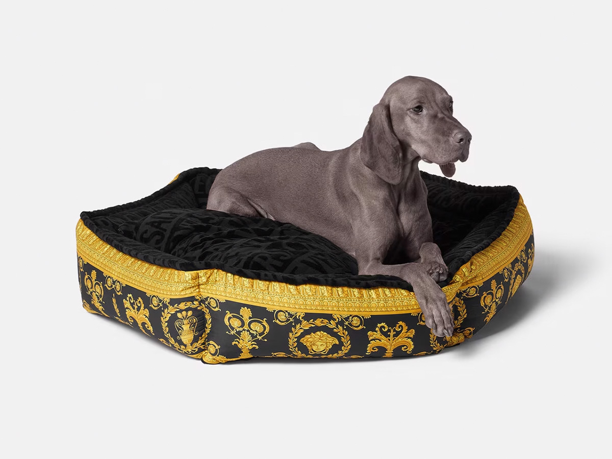This padded pet bed features a tonal Versace Allover motif with baroque trims and a removable interior cushion. Both the interior cushion and bed frame are equipped with zip closures for easy removal of the covers.