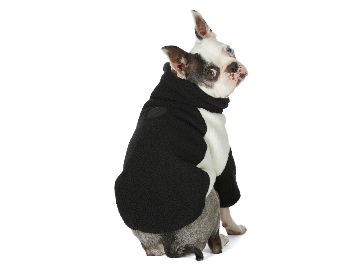 This long-sleeved sherpa jacket in black features off-white panels, a stand collar, zip closure, and an embroidered logo in white. The perfect fully-lined fleece dog onesie of your pooch’s dreams.