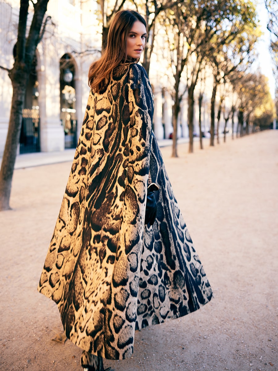 Cape, blouse, skirt and boots: Roberto Cavalli | Gloves: Thomasine