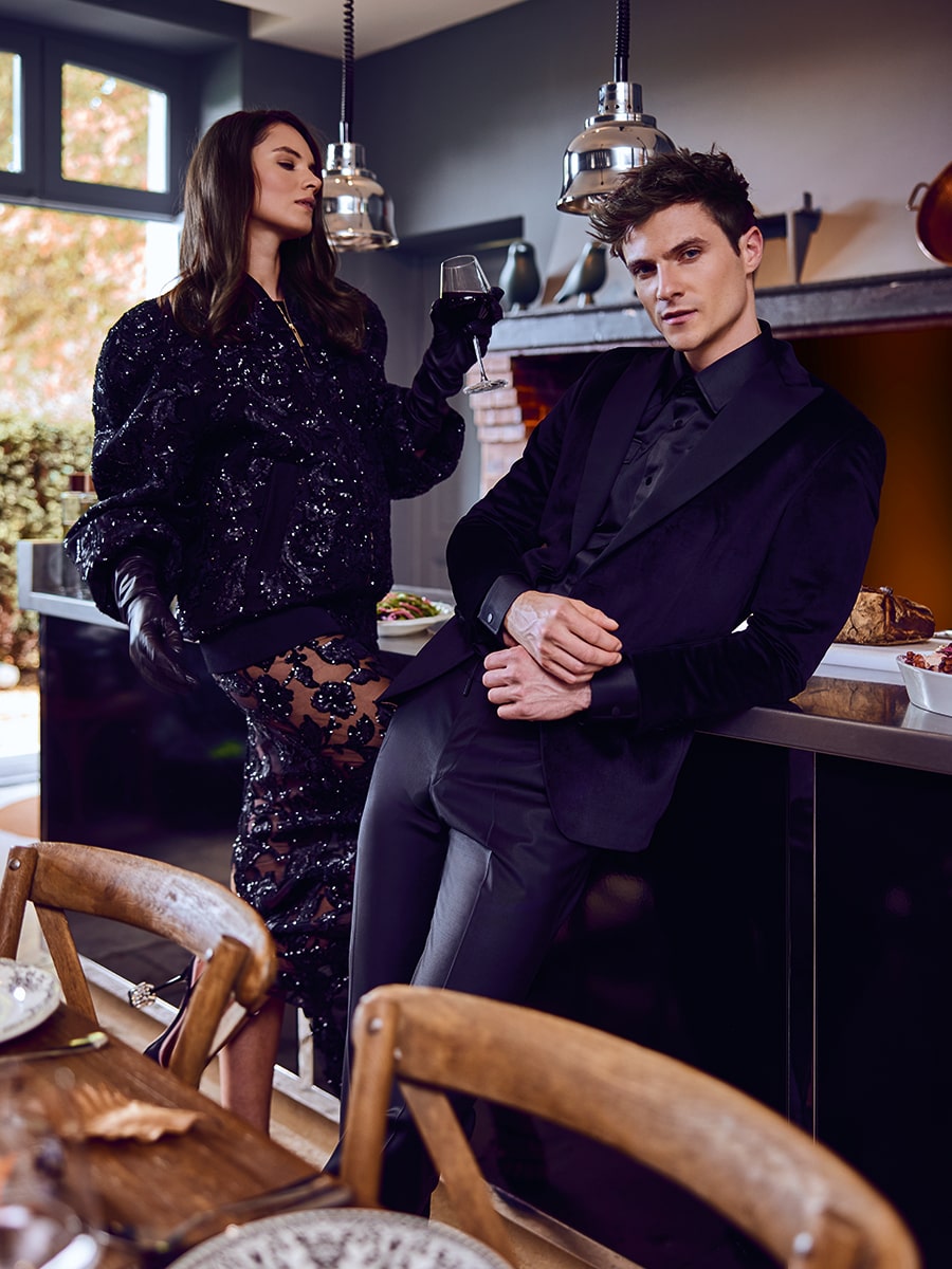 HIS: Blazer, dress shirt and pants: Etro | Shoes: Paul Smith