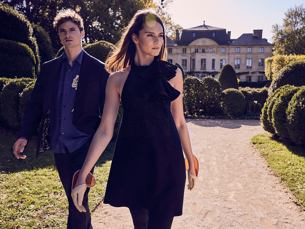 HERS: Jacket, skirt and shirt: Elie Saab | Shoes: Roger Vivier | Gloves: Elie Saab