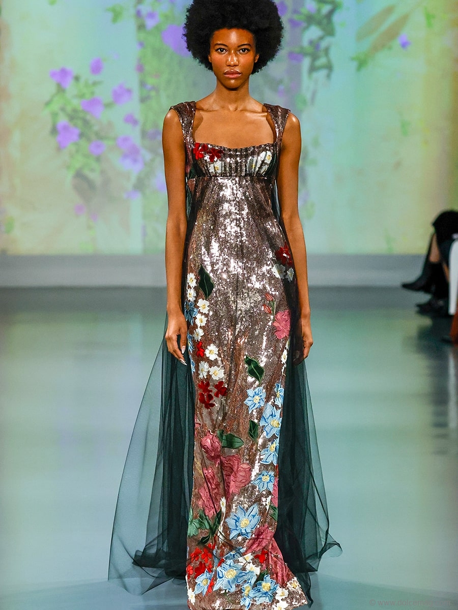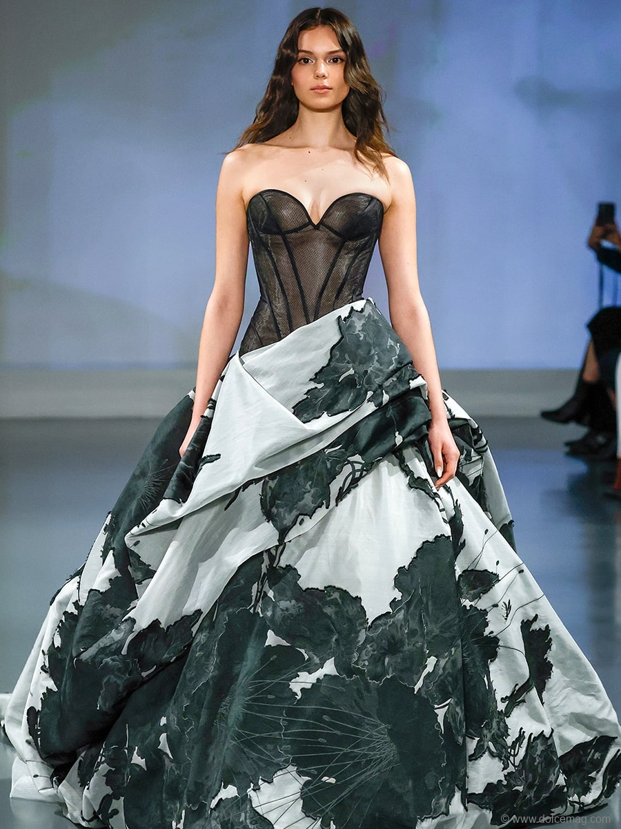 The looks in her Spring 2025 Collection feature displayed intricate workmanship, flowing skirts and sleeves, sweetheart lace, frosted bugle beads, ruffle edging, corsets and elaborately constructed gowns, including a dramatic strapless sweetheart trumpet gown. It was a triumph of the marriage of creativity, imagination, artistry and technology.