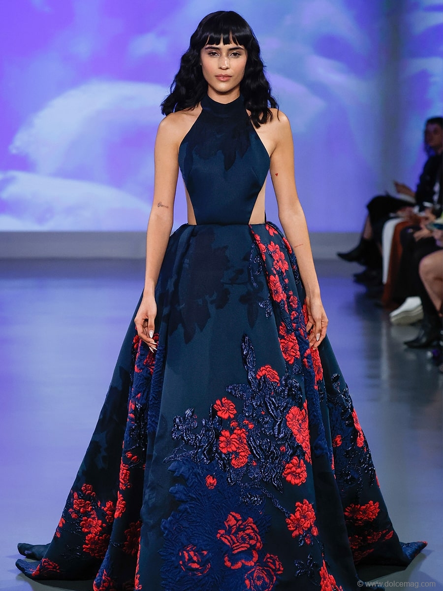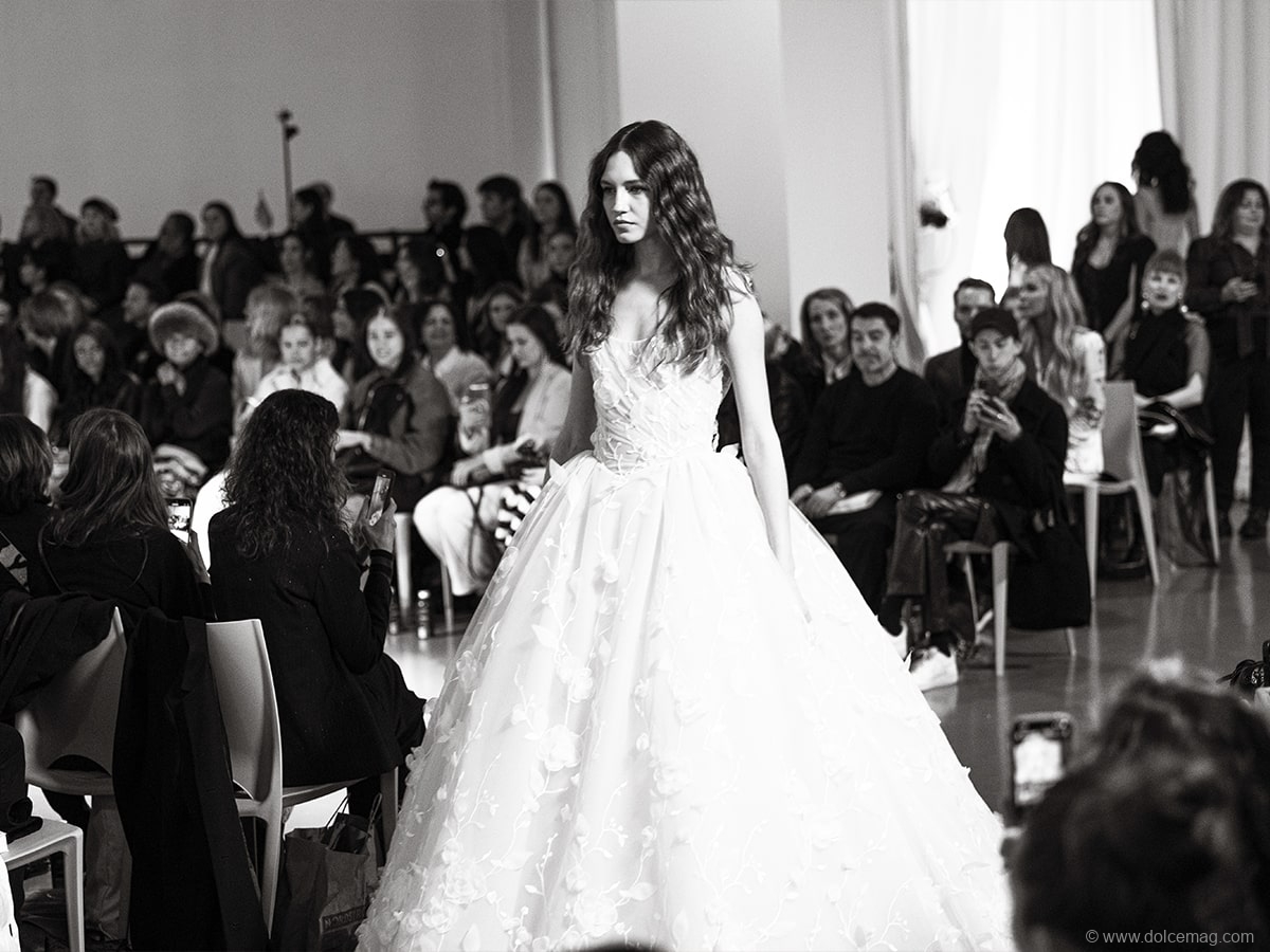 “In this digital age of algorithms, AI, and an abundance of screens, I wanted to explore the expression of my imagination and the very essential human aspect of creativity amplified by modern technology, blending the two worlds as seamlessly as possible,” says Di Santo of the spectacular display, which used huge screens used to capture and complement the creations which graced the runway. “It was our goal to use technology as a tool to enhance the viewers’ experience, so we designed an immersive environment utilizing projection mapping to showcase our collection of gowns that celebrate heritage craft and construction.”