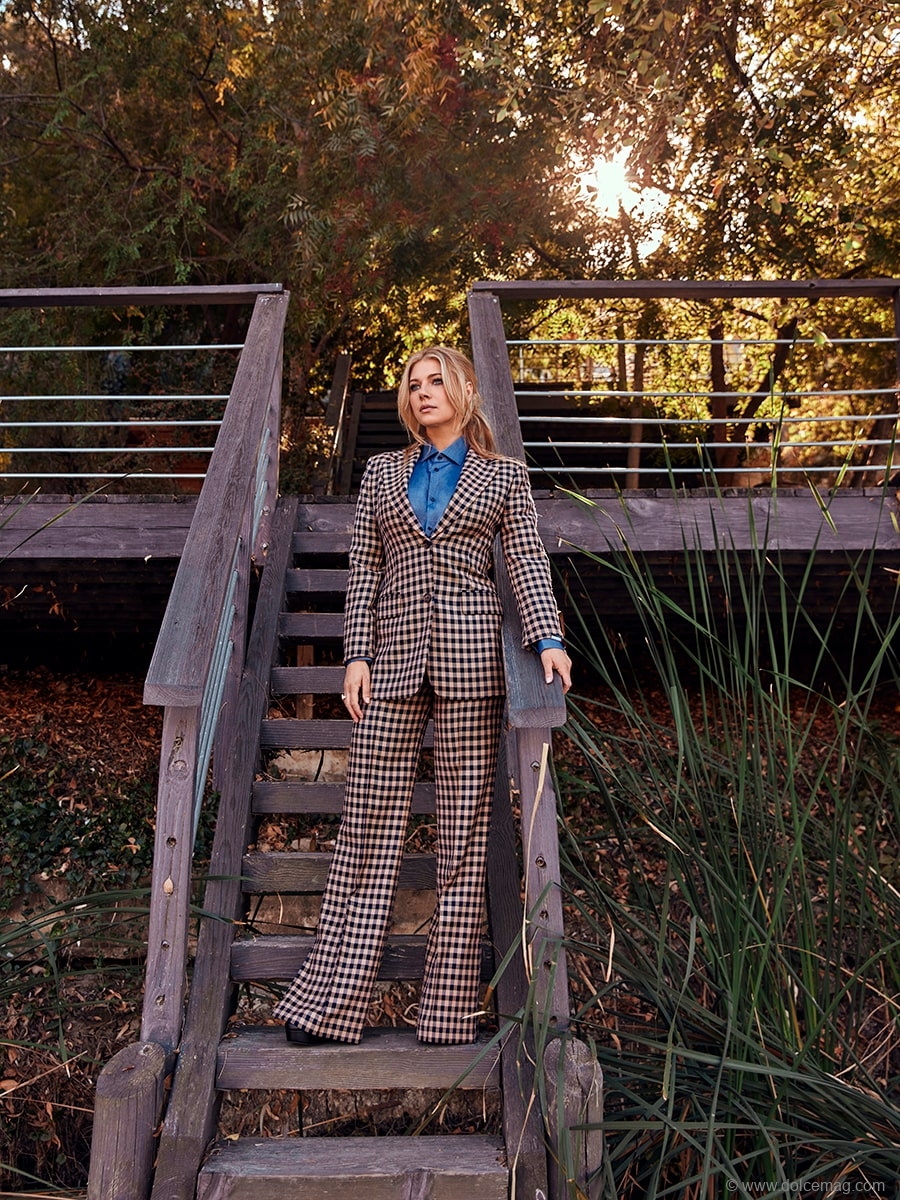 A: It’s really important to have a very healthy sense of mental health and wellness. I try to do at least one “nature thing” a day, if it is going for a hike or walk or spending time on the water if I’m in Los Angeles or the mountains; it’s really important to do that. Trying to get out there and see the sunrise if I can get up early enough, depending on work, or the sunset. I just think that really connects you to nature. In terms of fitness, obviously eating healthy and a gluten-free meal is important because I’m celiac, but I try to work out and weights are important. But I love the outdoors — I’m a skier and I’m a very active person. I want to be able to constantly do fun stuff on the go.