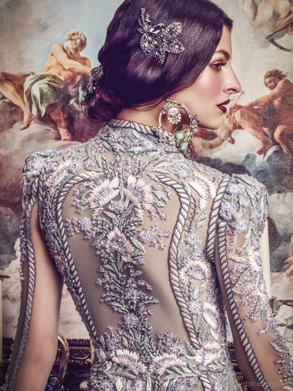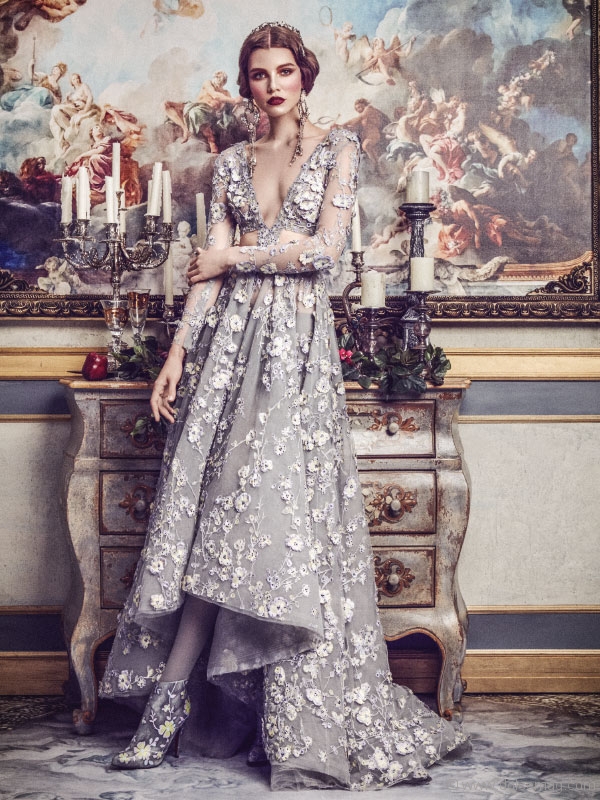 A. I used a lot of delicate tulle and lace. I love working with tulle because I can put a lot of intricate embroideries and beadwork on it and produce magic in the creation.