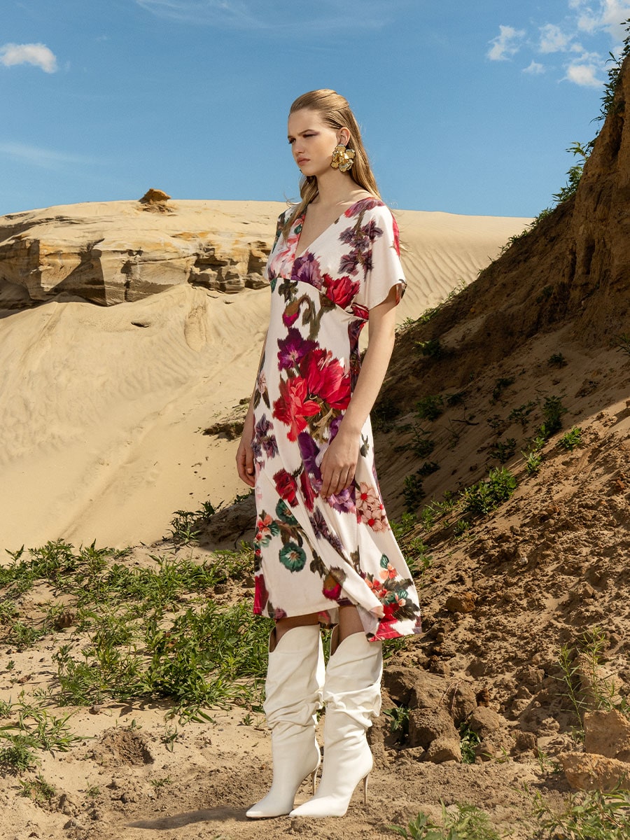 The BAMBI dress in red is true to it is name, with its delicate fabric and sweet floral pattern making a sophisticated and beautiful impression. | Photo By Isabelle Paradis Photographe