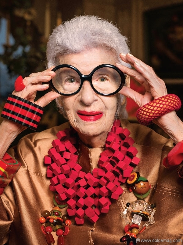 Easily recognizable in her eye-catching round glasses, Apfel has had a considerable impact on the use of oversized accessories, such as necklaces and bangles, and colourful, flashy clothing.