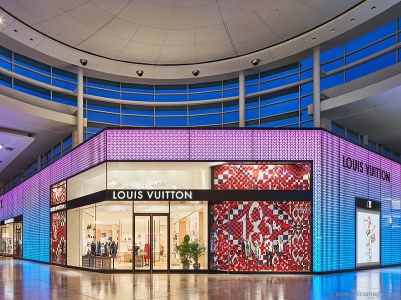 This is customer engagement on a new level, destined to become a focal point in the 270-store, two-million-square-foot shopping emporium. The grande facade is a two-storey LED screen, featuring illuminated animations of Louis Vuitton’s archetypal Monogram flower motif in ever-changing colours, punctuated with dramatic and revealing double-height display windows.