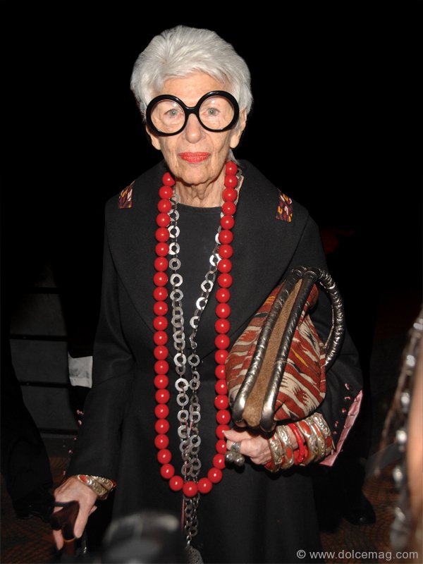 Being proud of her looks has always been something Iris ascribes to. More than comfortable in her venerable skin, she is appalled at modern women who fruitlessly obsess over maintaining a 20-year-old’s figure. “Wasn’t it Chanel that said, ‘Nothing makes a woman look so old than trying desperately to look young?’” Acknowledging that plastic surgery seems to be a “way of life,” Apfel just laughs at the insincerity that accompanies the physically altering procedures of modern surgery. As she notes, “I think if people put something inside their heads instead of outside their heads they would be much better off.”