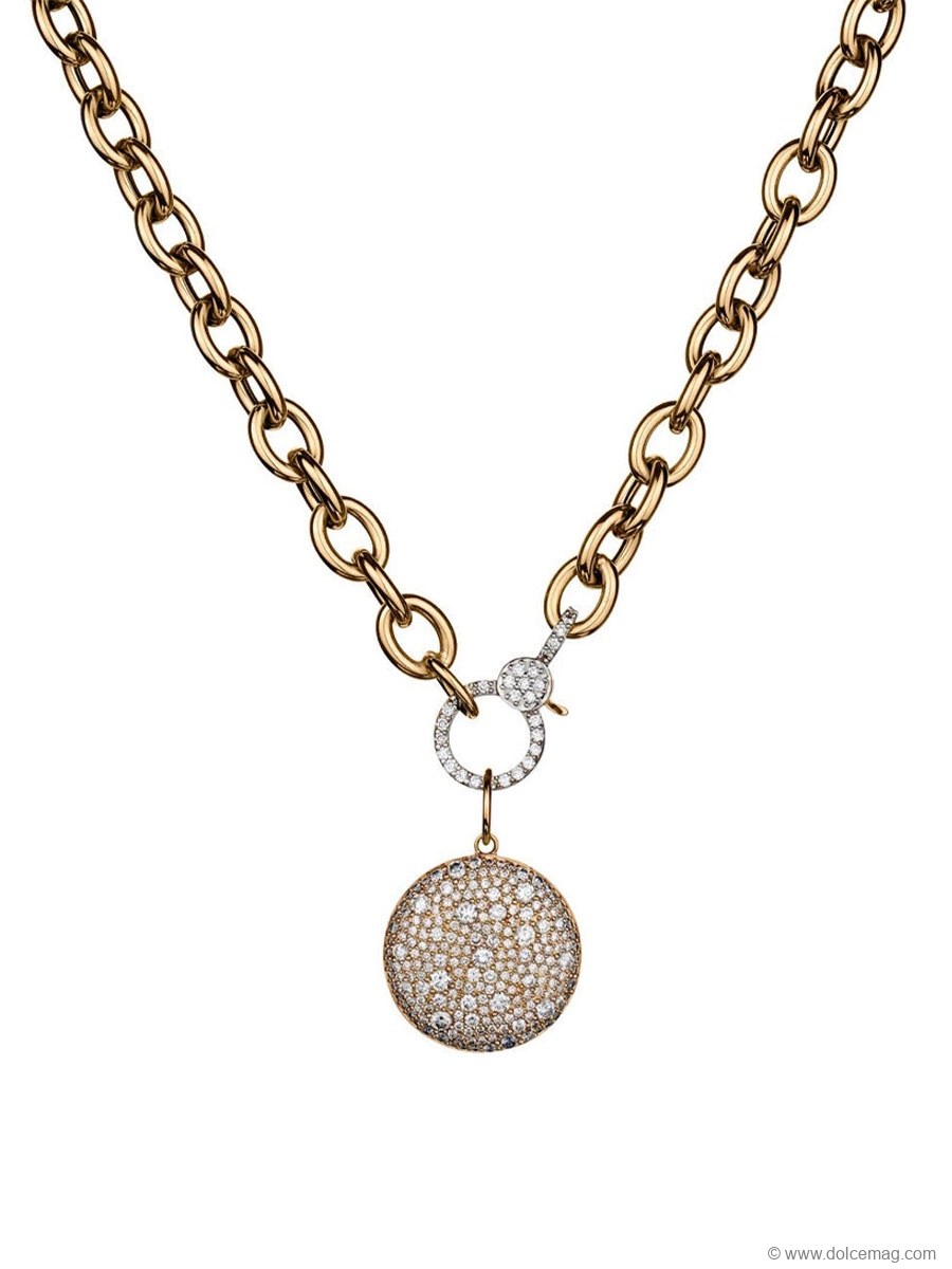 A 14k yellow gold pendant with 257 round brilliant-cut diamonds (2.25ct total weight), set on an 18” chain, creating an elegant and sparkling look.
