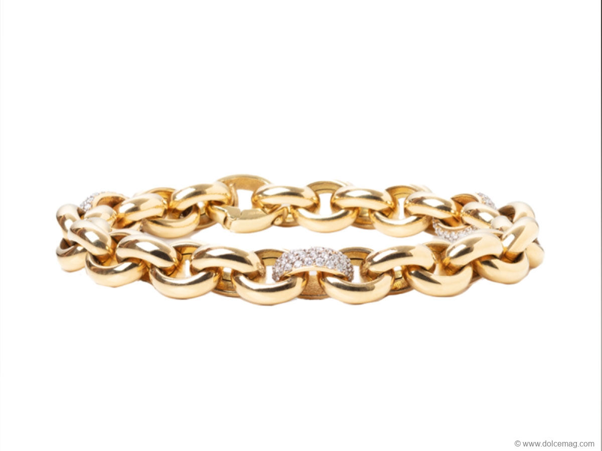 A bold 18k yellow gold chain bracelet featuring three links set with round diamonds, blending strength and elegance in one stunning piece.