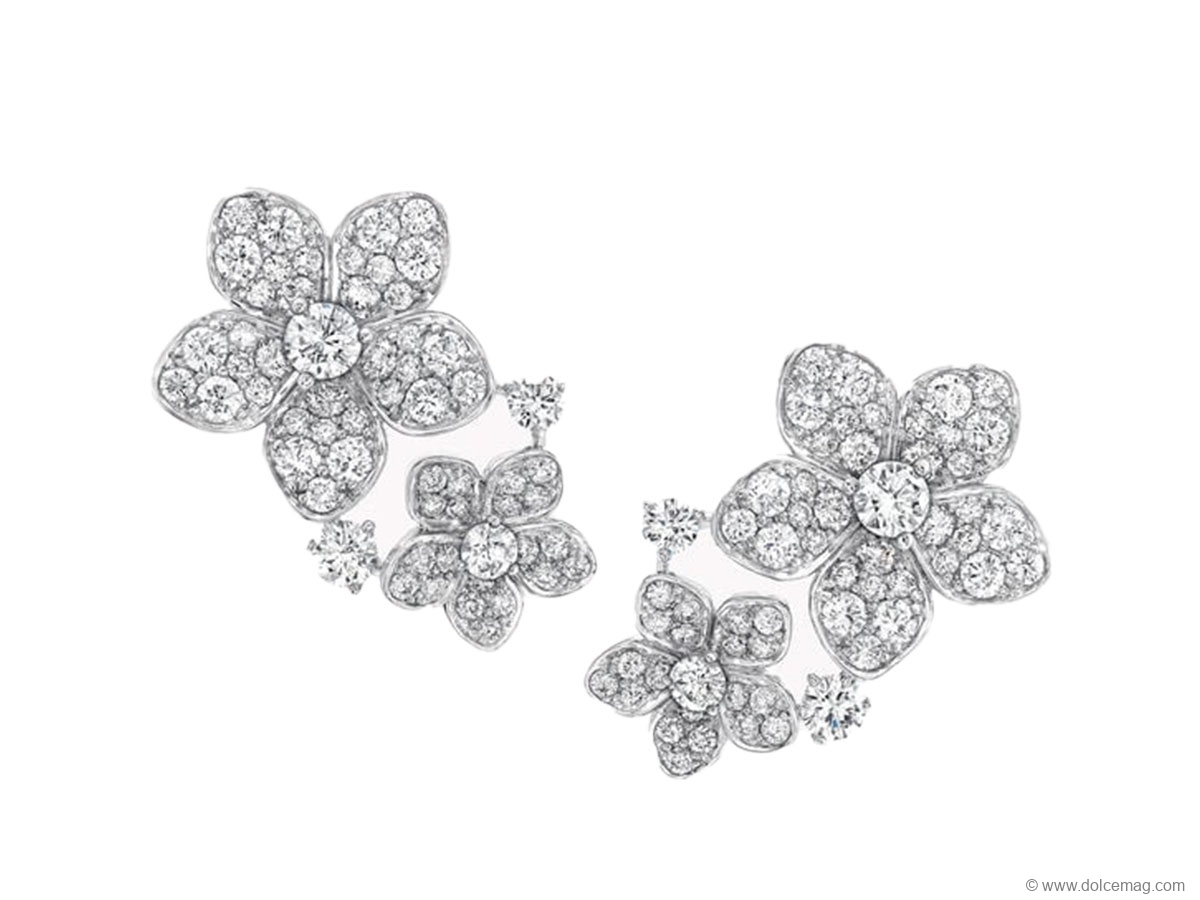 Inspired by nature, these white gold earrings feature pairs of diamond blossoms arranged with carefree charm, capturing the beauty of an untamed garden.
