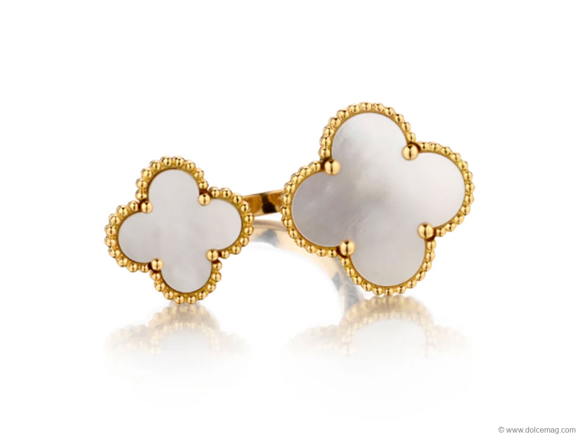 18k yellow gold ring featuring two mother of pearl stones in the signature Magic Alhambra design, adding timeless elegance to your collection.