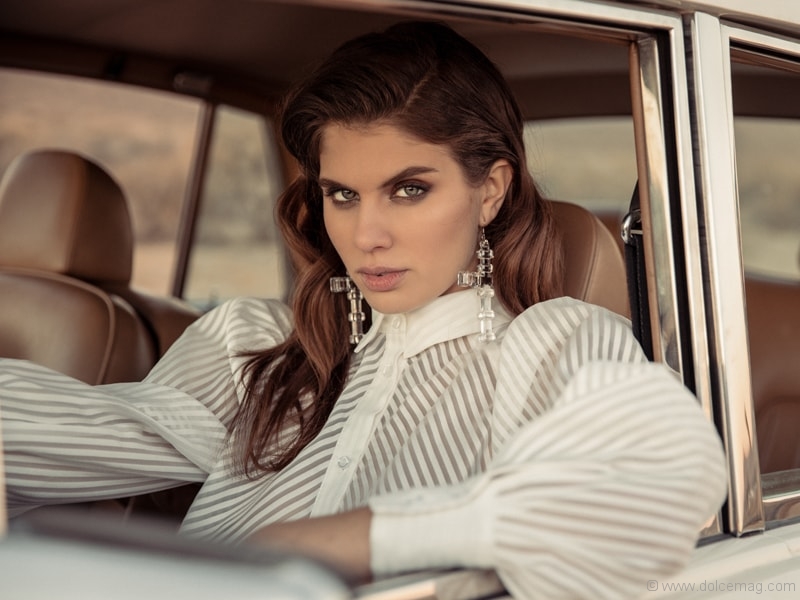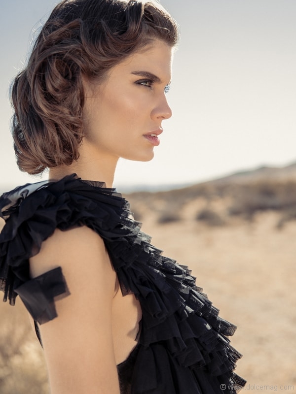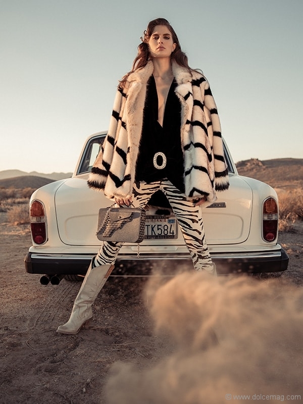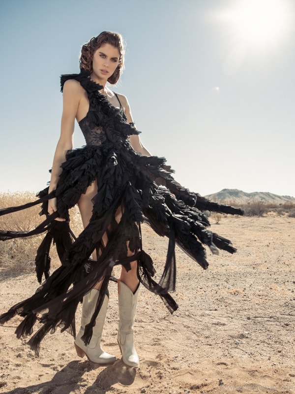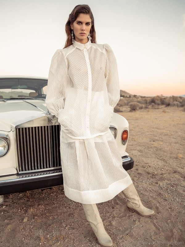 Nothing to see but dirt for miles. But wait, there she is — a vision. In this deserted landscape, fashion makes itself seen.