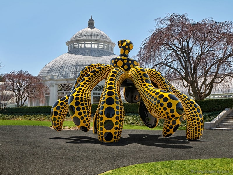 In and around the Enid A. Haupt Conservatory, Kusama’s plant-inspired polka-dotted sculptures are nestled among meadow grasses, bellflowers, water lilies and other plantings. The glorious outdoor displays of tulips and irises in the spring have now given way to dahlias and sunflowers for these summer months, to be followed by masses of pumpkins and autumnal flowers this coming fall. Also featured this fall will be stunning displays of meticulously trained kiku (Japanese for “chrysanthemum,” one of that country’s most heralded fall-flowering plants), which will create dramatic finale for the abundant displays at the conservatory.