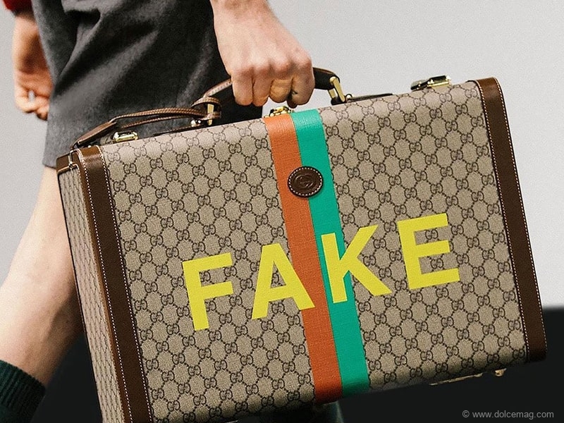 2. Upon first glance at this Gucci leather-trimmed suitcase, observers might think it’s a “Fake”, until they see the other side, which says, “Not.”