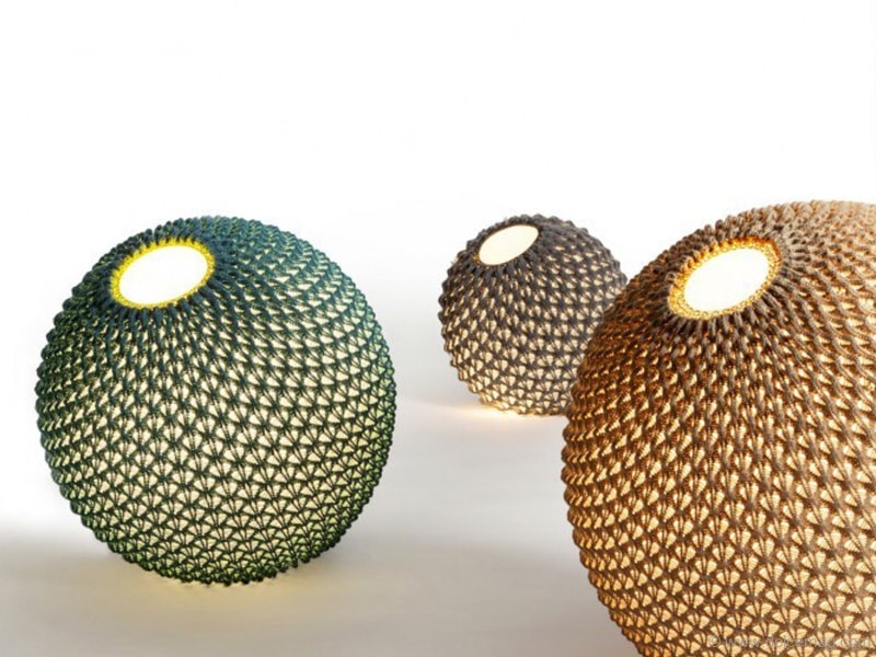 Winner of an A’Design Award, Knitted is a series of lightings that combines technology with tradition. Knitting acrylic threads in fixed patterns with wool crochet creates a three-dimensional sheet of fabric that serves as a lighting fixture. The project is a collaboration between designers Ariel Zuckerman and Oded Sapir, with the aid of textile designer Adva Bruner.