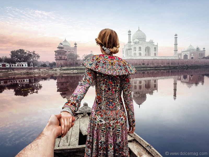 #FollowMeTo was first sparked almost accidentally in 2011, when Murad and Nataly vacationed together for the first time in Barcelona, and Murad did as any photographer would: he documented their journey with his beautiful girlfriend at the heart of each shot. Diving deep into Murad’s Instagram account, @muradosmann — over 200 weeks deep, to be exact — one will unearth that first, very poignant snapshot: clad in a pink plaid shirt, a slightly out-of-focus Nataly guides her companion toward a colourful wall of graffiti on an undisclosed street in Barcelona. From the moment of its posting, the venture swiftly went viral, with Murad’s account rising to its current 3.8 million followers.