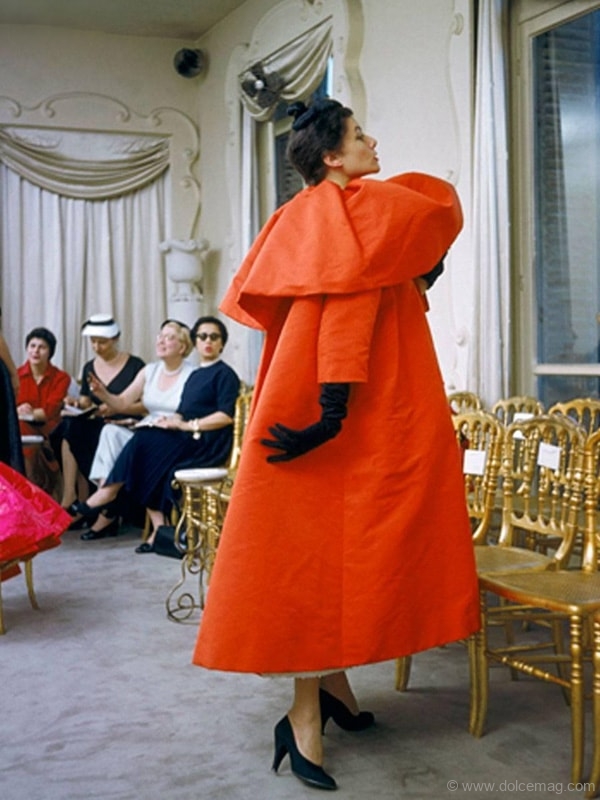 10. MARK SHAW, BALENCIAGA, ORANGE COAT SIDE, 1953: Originally published in LIFE in 1954, this Mark Shaw print shows a model posing for buyers in a coat designed by luxury fashion house Balenciaga.