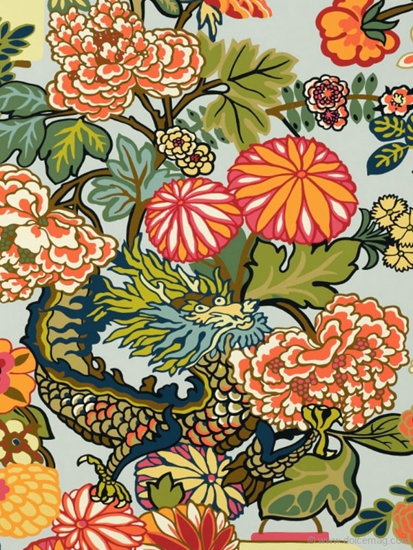 14. SCHUMACHER CHIANG MAI DRAGON CHINOISERIE AQUAMARINE WALLPAPER: Inspired by the art deco movement and embellished with chinoiserie motifs, this is a wallpaper that’s hand-screen printed.