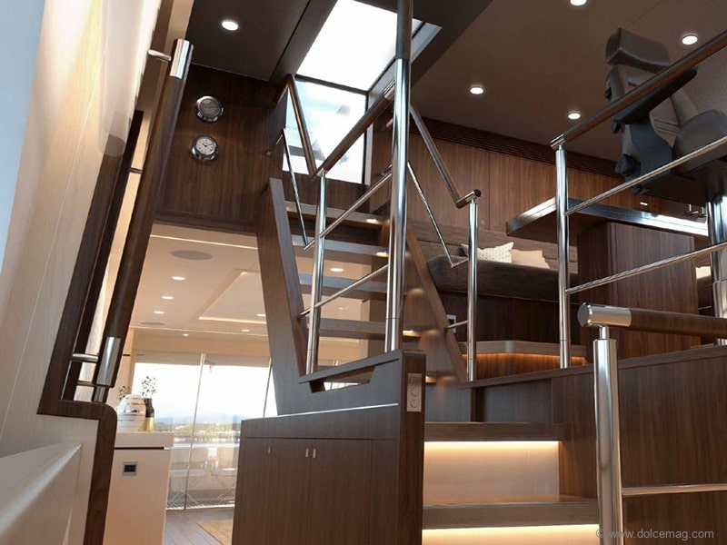 Of the numerous details requested, it’s the pastel blue hull that’s most noticeable. That’s not to say it’s the only detail, though. As well as a flybridge for outdoor activities, gate doors and stainless steel additions have been included around the swim platform.